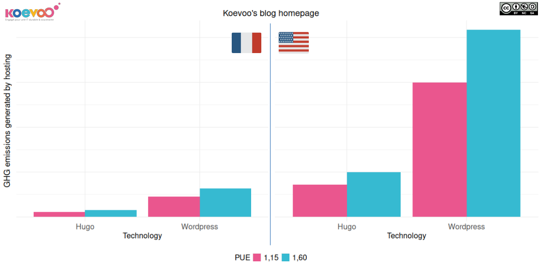 We then compare hosting in France and in the USA, based on carbon intensity data from the impacts database of ADEME. Finally, we compare a PUE of 1,6 (which is the mean value of PUE for data centers in the EU(7)) to a low PUE of 1,15.